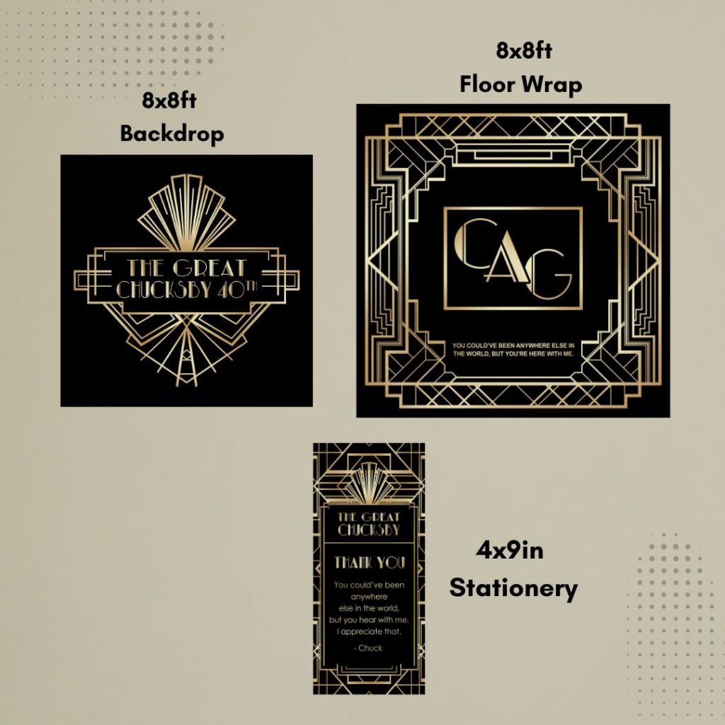 Elevate your event with a complete visual experience. This bundle includes a custom photo backdrop, coordinating event stationery (up to 100 count), and a personalized 8×8 floor wrap designed to tie your entire theme together. Perfect for creating a cohesive, stylish look from the moment guests arrive.